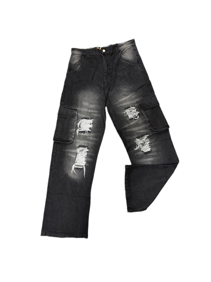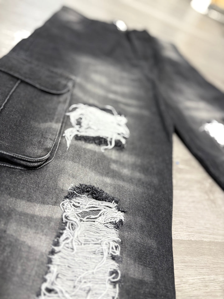 Design: Distressed detailing with raw hems for an edgy aesthetic.